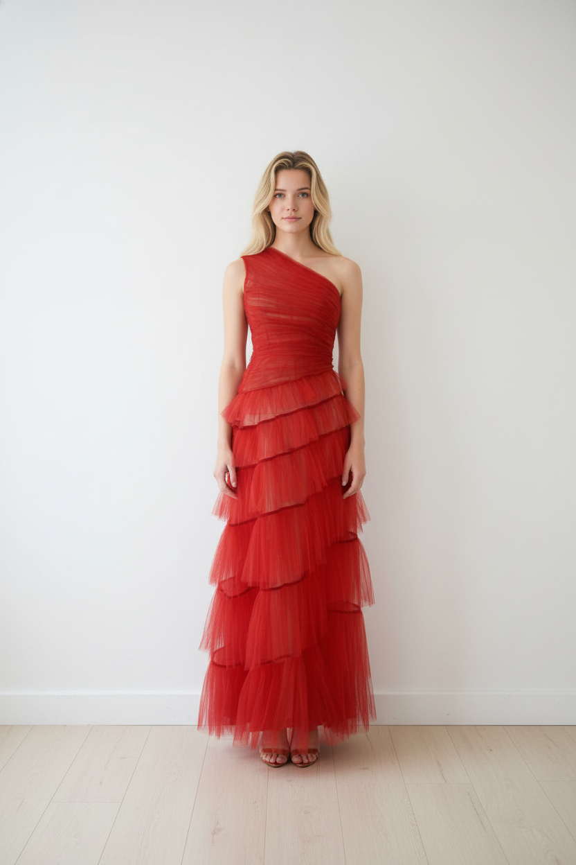 The Aleyas Dress is an incredible red tiered dress. This is a unique piece with a stunning neckline.