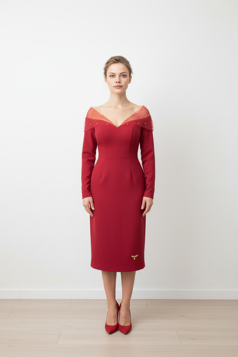 The Amiya dress is a stunning red off the shoulder pencil dress with tulle bow detail.