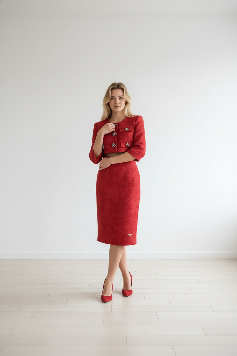 The Amliya Suit is a stunning red tweed suit featuring jewel embellished buttons on the jacket