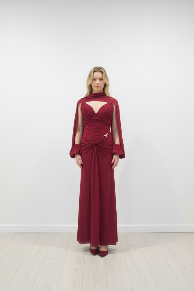 The Amma dress is an elegant, full length gown. The dress features a elaborate neckline and sleeves, which provide a classic and sophisticated look.