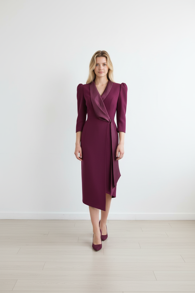 The Ammi dress is a stunning tuxedo pencil dress with a matching satin collar. It features an elegant asymmetric hem and unique sleeves. One of the standout details is the draping satin sash, adding a subtle touch of texture.