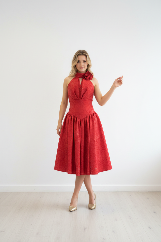 The Ania dress is an elegant, full-length dress. The dress features an elegant neckline with a flower detail, which provide a classic and sophisticated look.