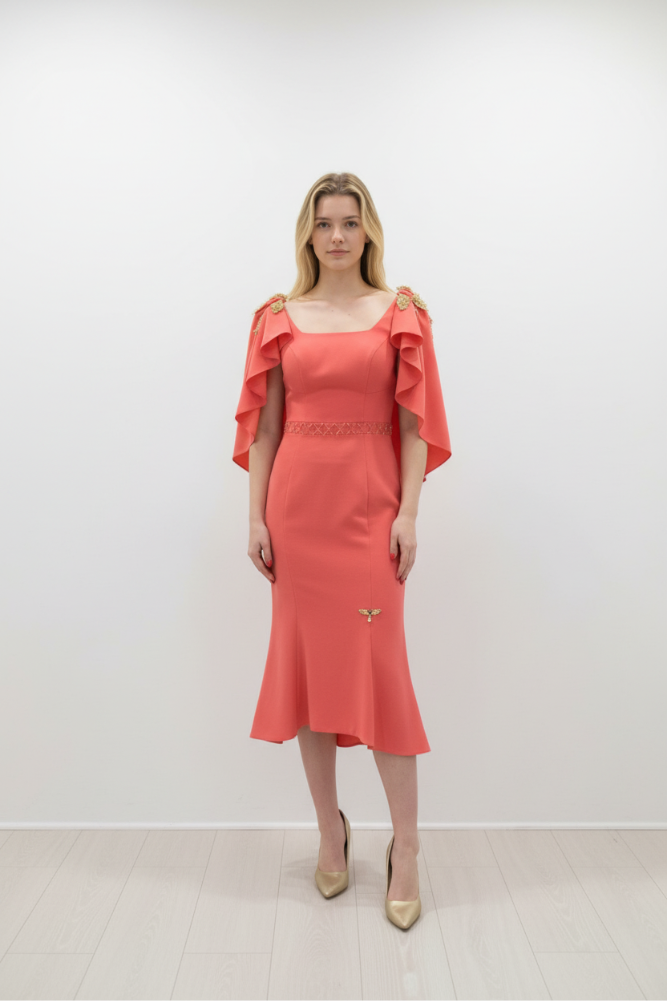 The Anne dress is a stunning coral fishtail dress with an lace embellished top with cape back detail.