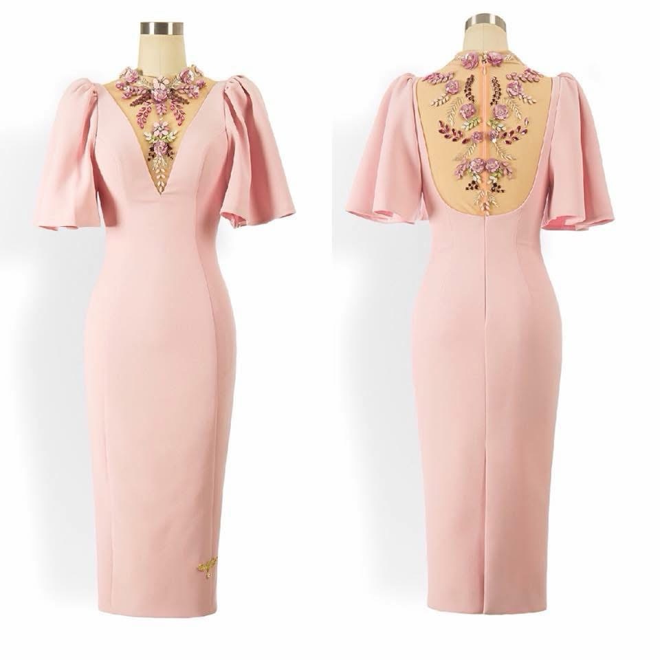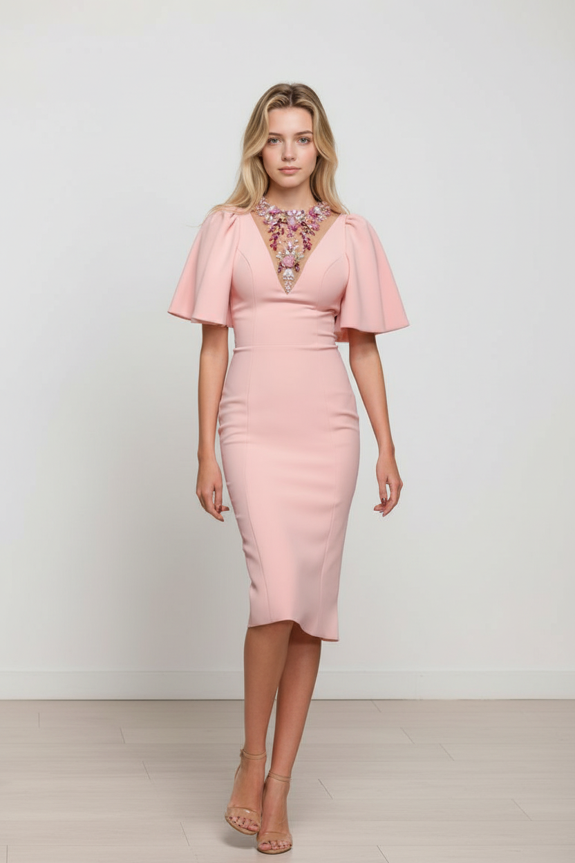 The Auriel Dress is an elegant pink midi-length dress. One of the standout details is the embellishment on the neckline, adding a subtle touch of texture.