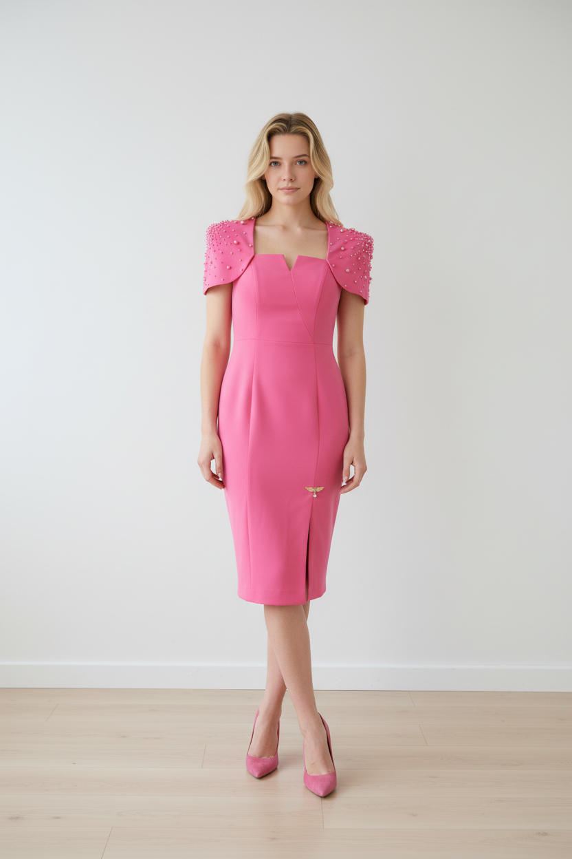 The Ayara Dress is an elegant pink pencil dress, featuring a cap sleeve adorned with matching pearls. Coupled with a flattering square neckline, you are sure to impress with this design.