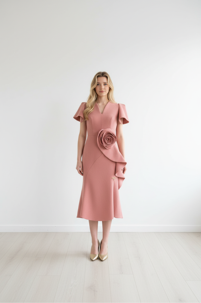 The Beata dress is an elegant rose colour, high low fishtail dress. One of the standout details is the flower detail on the front , adding a subtle touch of texture