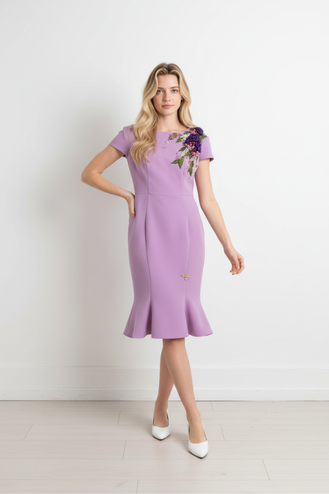 The Bec Dress is an elegant lilac dress with flower embellishment and a fishtail skirt.