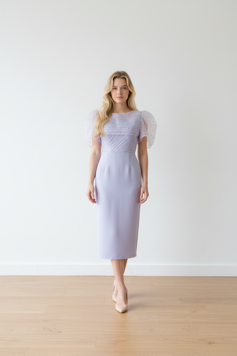 The Becca dress features a fitted lilac ruched bodice with an elegant, detachable sheer puff sleeves with lilac pearls, paired with a fitted lilac skirt.