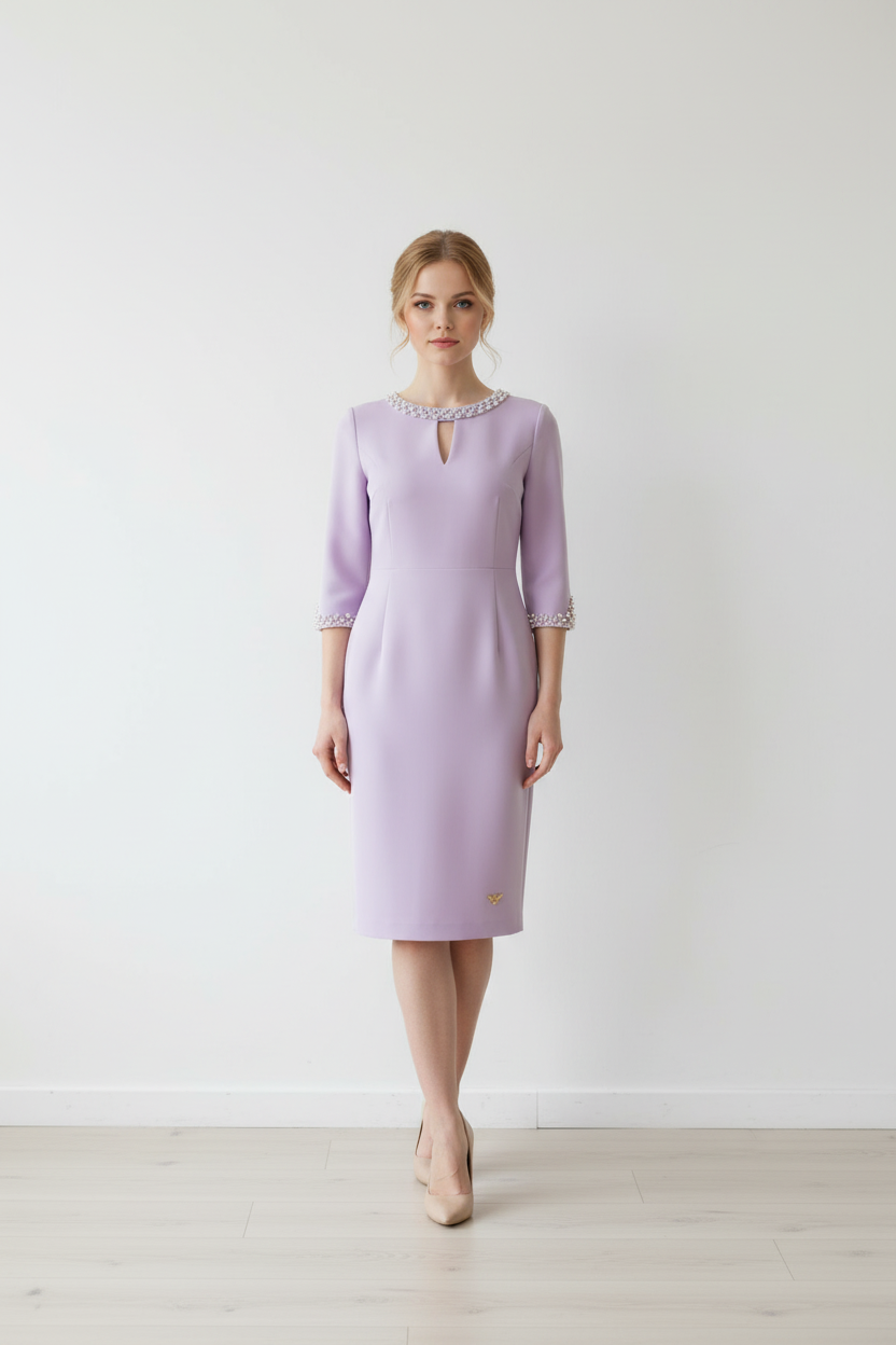 The Becks Dress is an incredible pencil dress. This piece features a curve neck and back details and a matching lilac pearls trim.