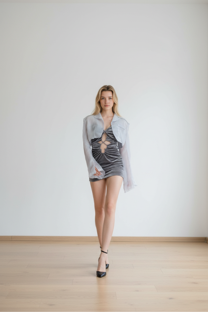 The Cathe dress is an elegant, mini-lenth velvet dress with a chain detail. the dress also features a long sleeve bolero with a flare sleeve, adding to the sophistication and elegance.