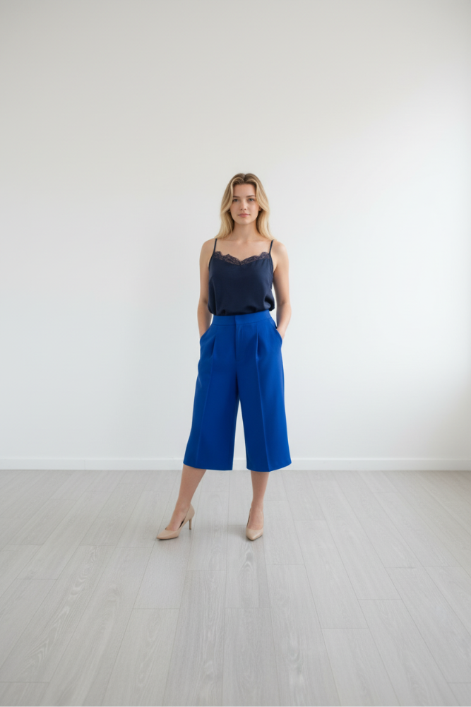 The Cindel trousers are stylish culottes style trousers, cut from a rich cobalt blue material.