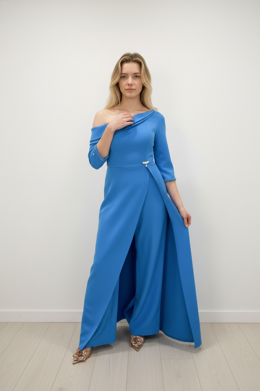 The Cod Jumpsuit is a show stopping blue jumpsuit. It features one shoulder, beaded sleeve hem and overskirt.
