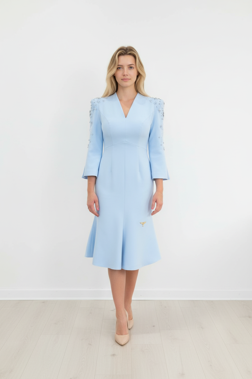 The Corai dress is an elegant pale blue fishtail dress. It features a V neckline, and intricate silver embellishment on both sleeves.