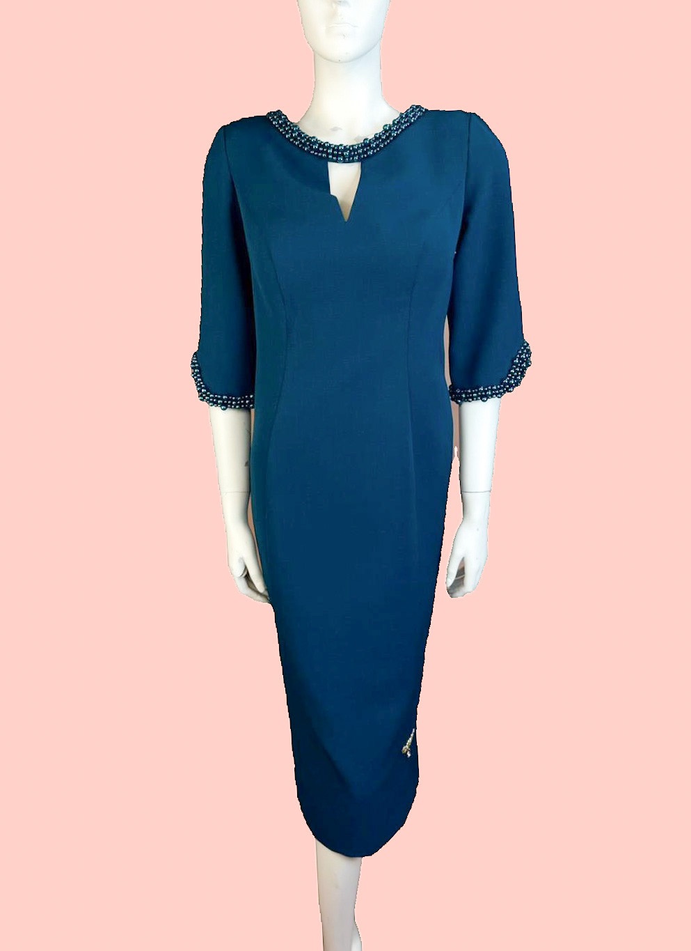 The Dev dress has a classic pencil skirt with a pearl embellished boat neck and structured shoulder. It is cut from a unique teal material with a subtle silver flecks.
