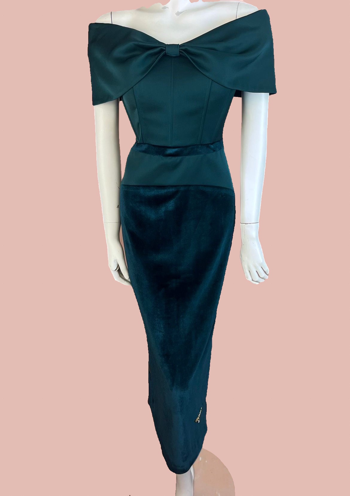 The Dorai Dress is an elegant, midi-length dress crafted in refined velvet and taffeta fabric, featuring a modest, off-the-shoulder neckline, which provides a classic and sophisticated look. One of the standout details is the velvet fabric, adding a subtle touch of texture.