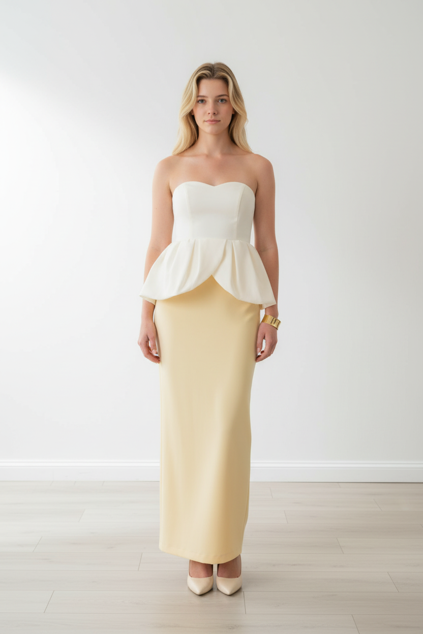 The Eall Dress features an elegant, full-length skirt. This is paired with a sophisticated, pastel yellow peplum top
