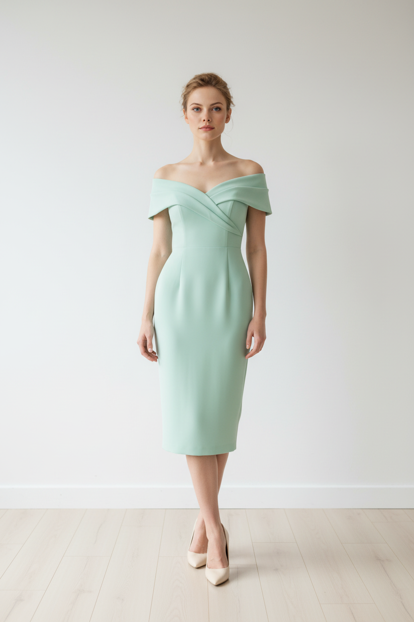 The Ef dress is available to purchase online or in store off the rack in standard sizes 6-16. Alternatively, you can order the Ef dress in a variety of colours and tailor it to your unique taste and style. The Ef dress is a elegant off the shoulder pencil dress with a slit at the back.