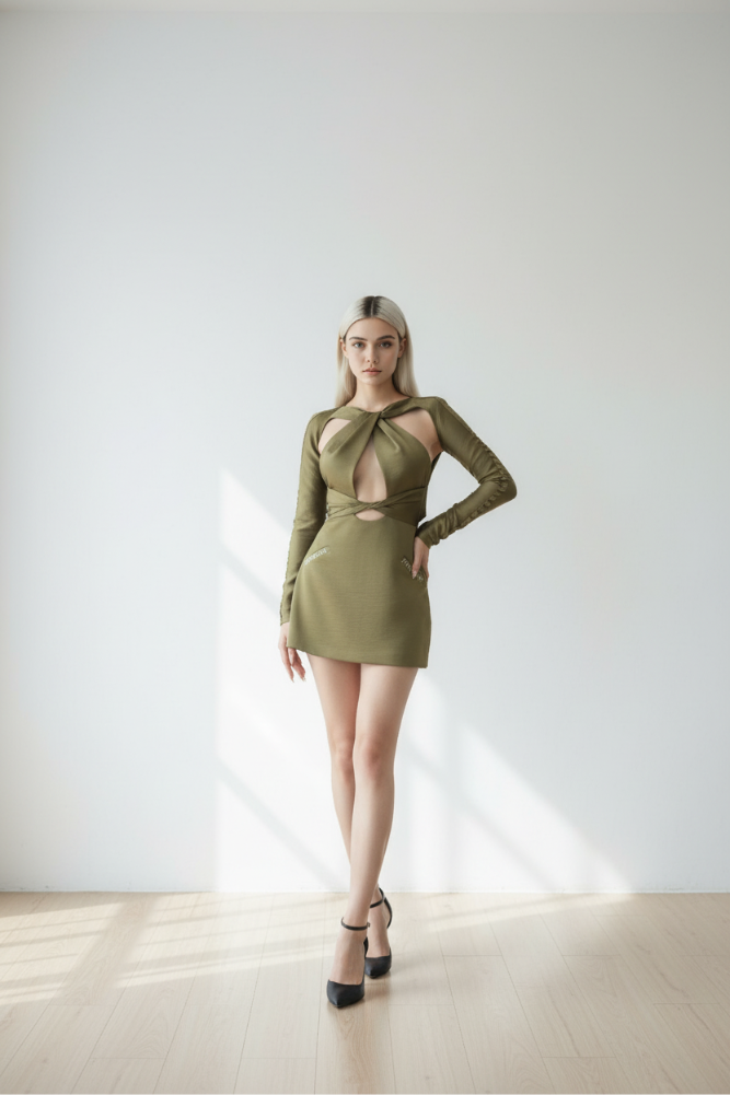 This striking olive green dress features a sleek neckline with a full sleeve and a cut out on the chest for added drama. This design wraps gracefully around the body creating a flattering silhouette.