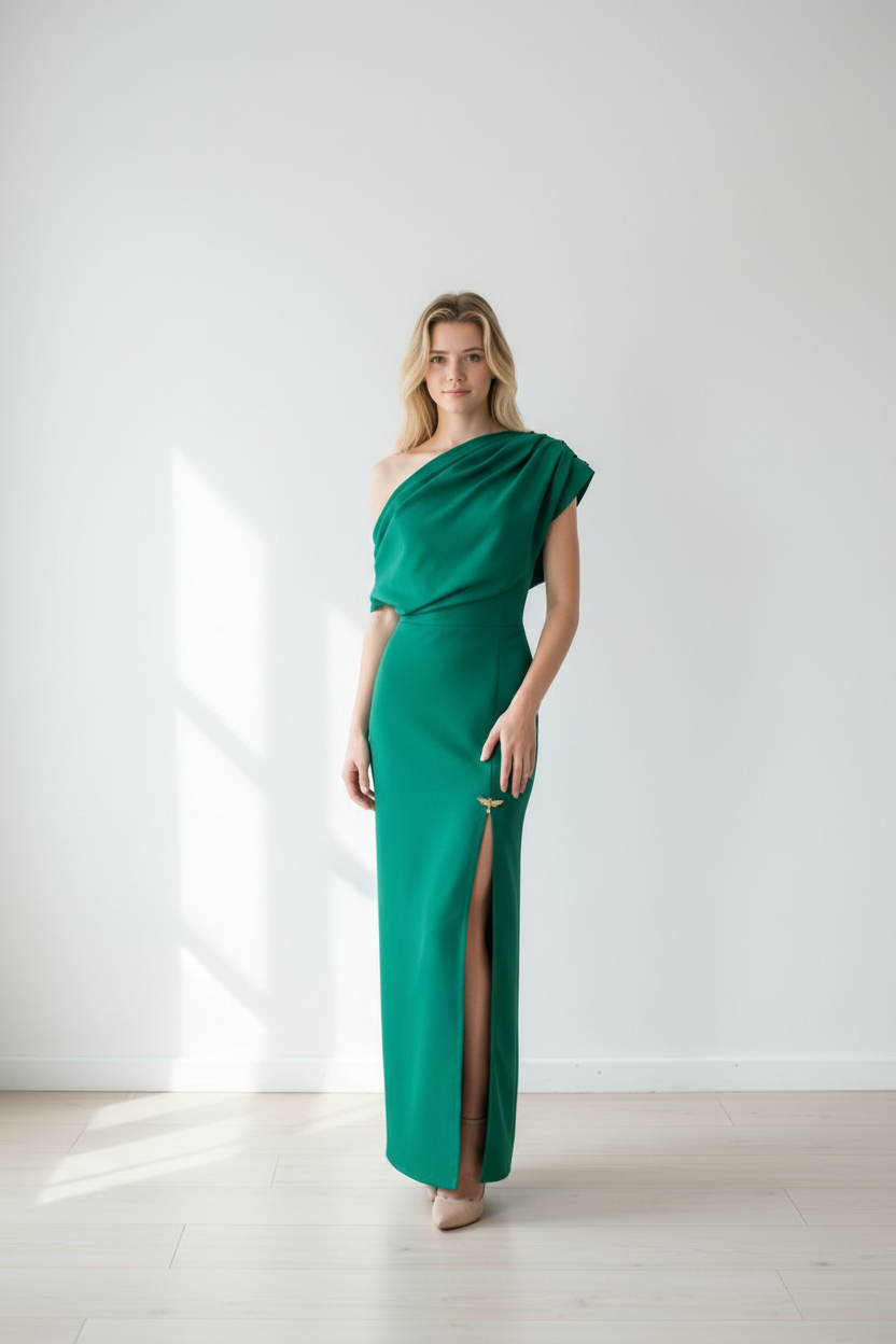 The Ell dress is an elegant, full-length one shoulder dress One of the standout details is the embellishment , adding a subtle touch of texture.