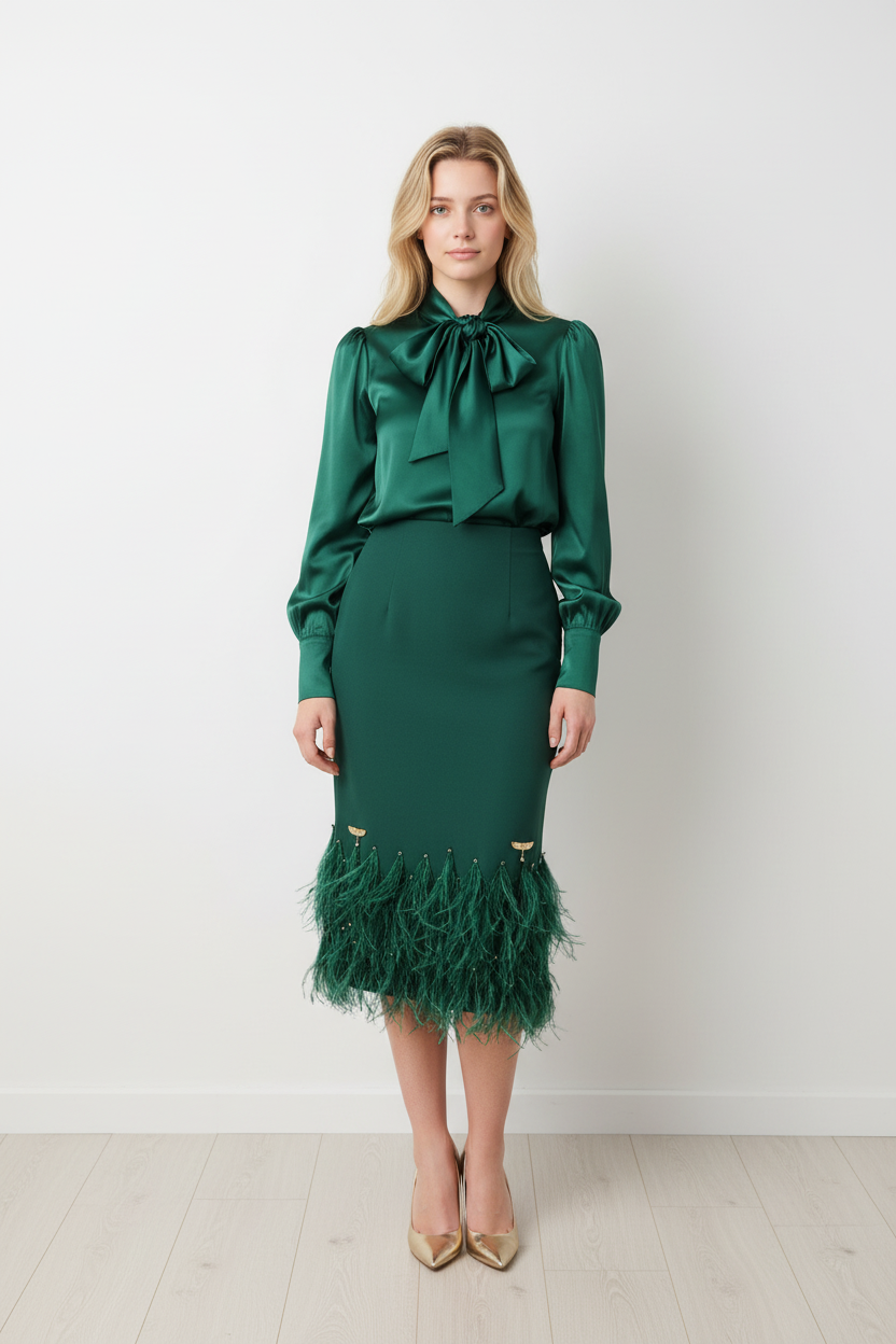 The Ellie Suit is a stunning green silk high neck top with a feathered pencil skirt.