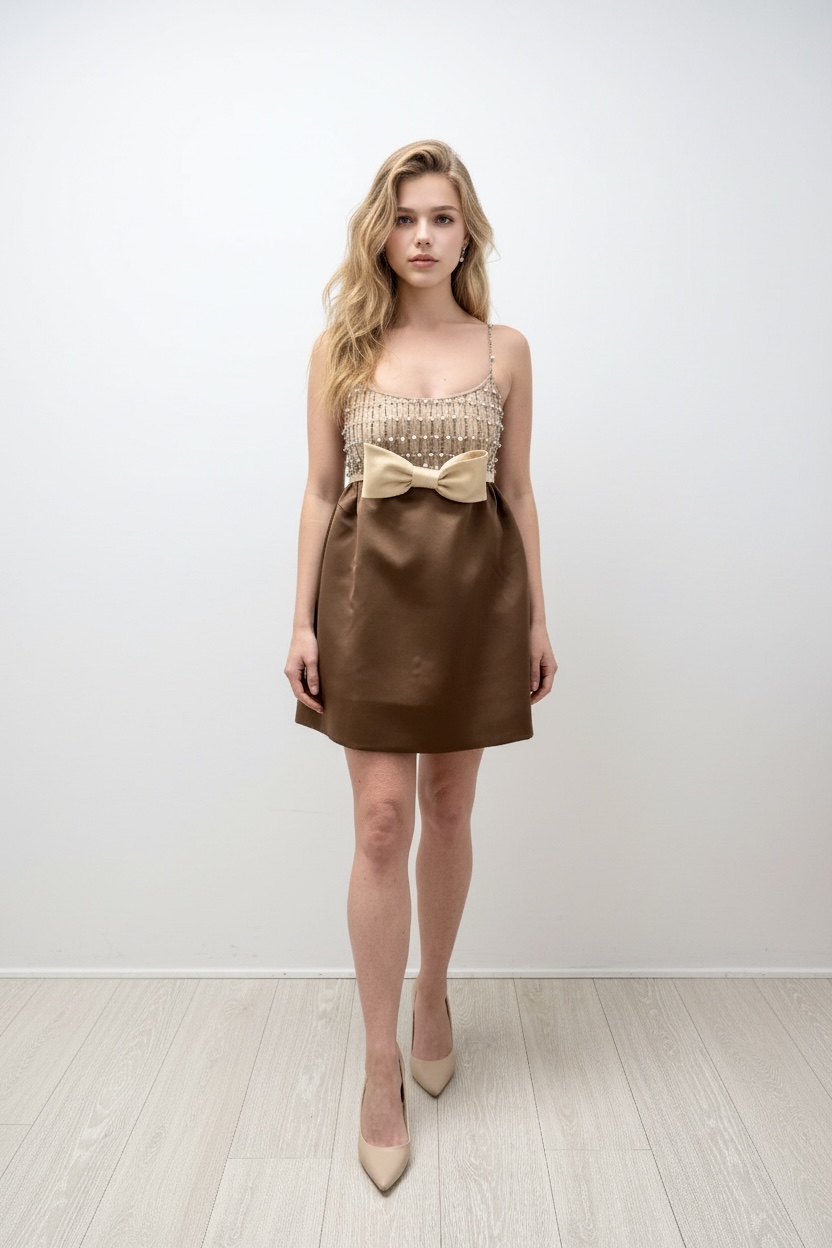 The Gada Dress is a stunning pale blue mini dress, designed with a flattering subtle A-line silhouette. This eye-catching piece features a distinctive pastel yellow bow at the waistline. The bodice is delicately embellished and finished with spaghetti straps.