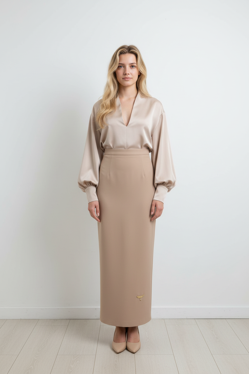 The Gaddie Suit is an elegant silk top and a long brown coloured skirt.
