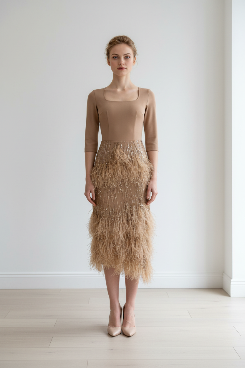 The Gan Dress is a stunning beige featured dress, it features a embellished featured hemline.