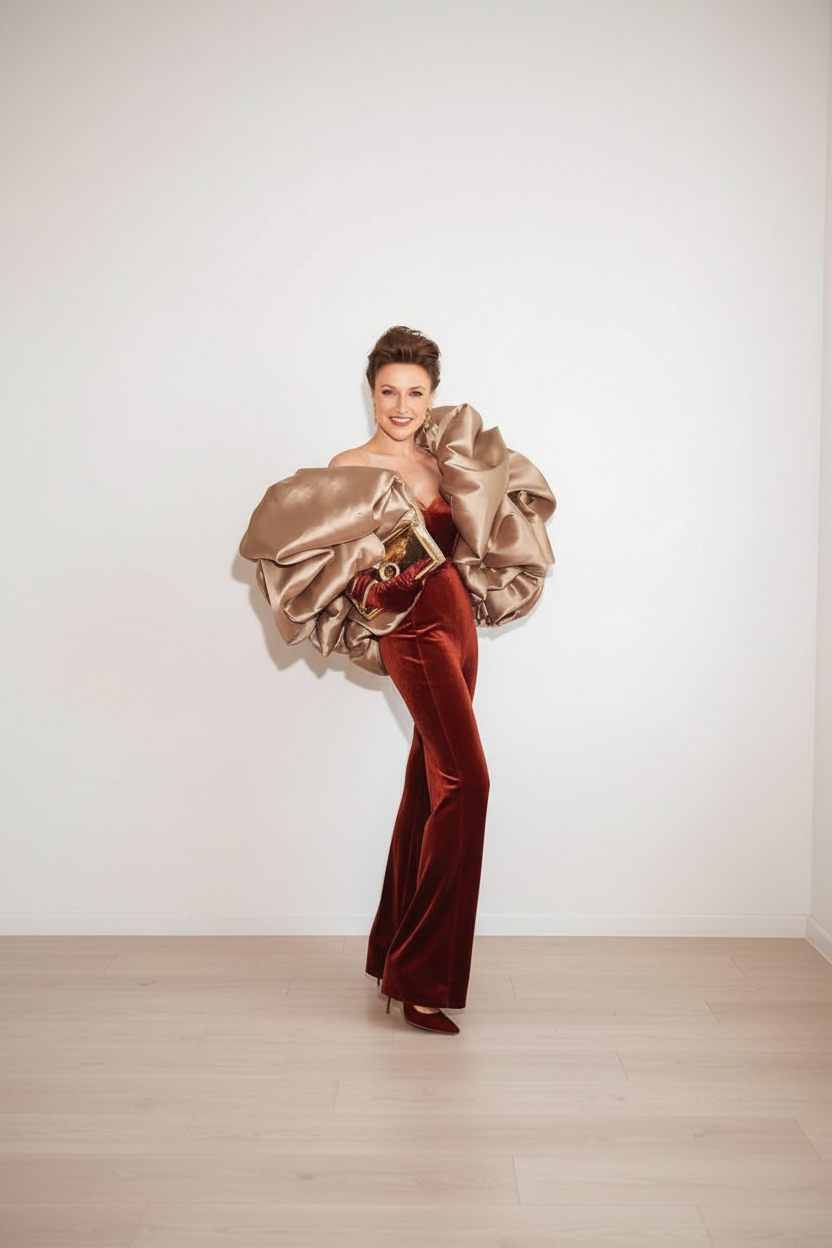 The Ganaei dress is available to purchase online or in store off the rack in standard sizes 6-16. Alternatively, you can order the Ganaei dress in a variety of colours and tailor it to your unique taste and style. The Ganaei dress feathers a velvet sweetheart neckline fishtail gown with a large ruffled shawl.