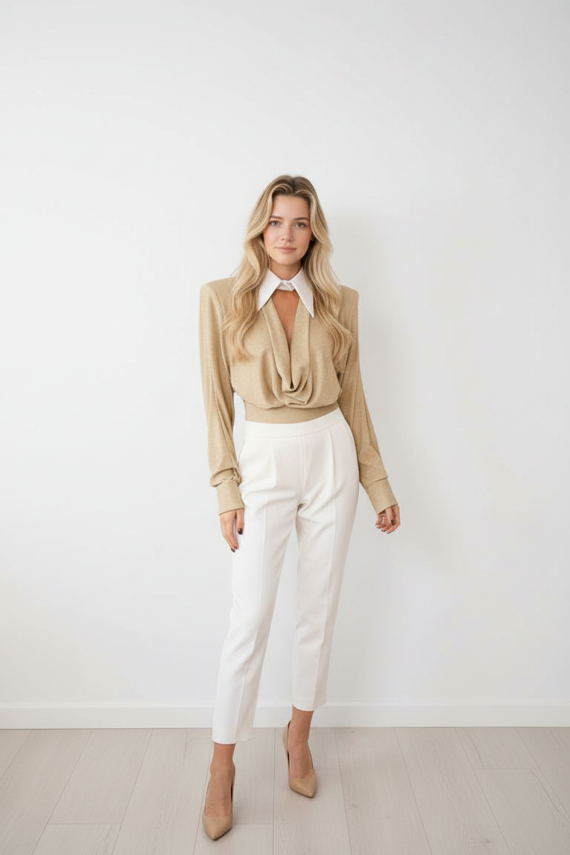 The Ganai Blouse is a stunning goldĀ blouse with an ivory tuxedo buttoned collar. It features shoulder pads that gives a structured shape and is made from luxurious gold fabric with a glitter effect.