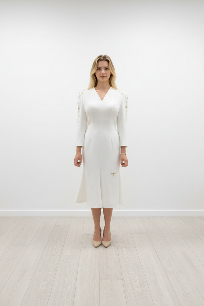 The Iame dress is an elegant, three-quarter-length dress crafted in a refined ivory fabric, featuring a modest, V neckline with three-quarter length sleeves, which provide a classic and sophisticated look. One of the standout details is the intricate silver embellishment on both sleeves, adding a subtle touch of texture.