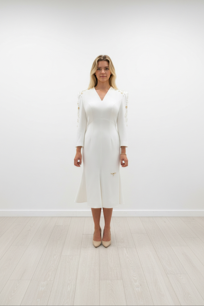 The Iame dress is an elegant, three-quarter-length dress crafted in a refined ivory fabric, featuring a modest, V neckline with three-quarter length sleeves, which provide a classic and sophisticated look. One of the standout details is the intricate silver embellishment on both sleeves, adding a subtle touch of texture.