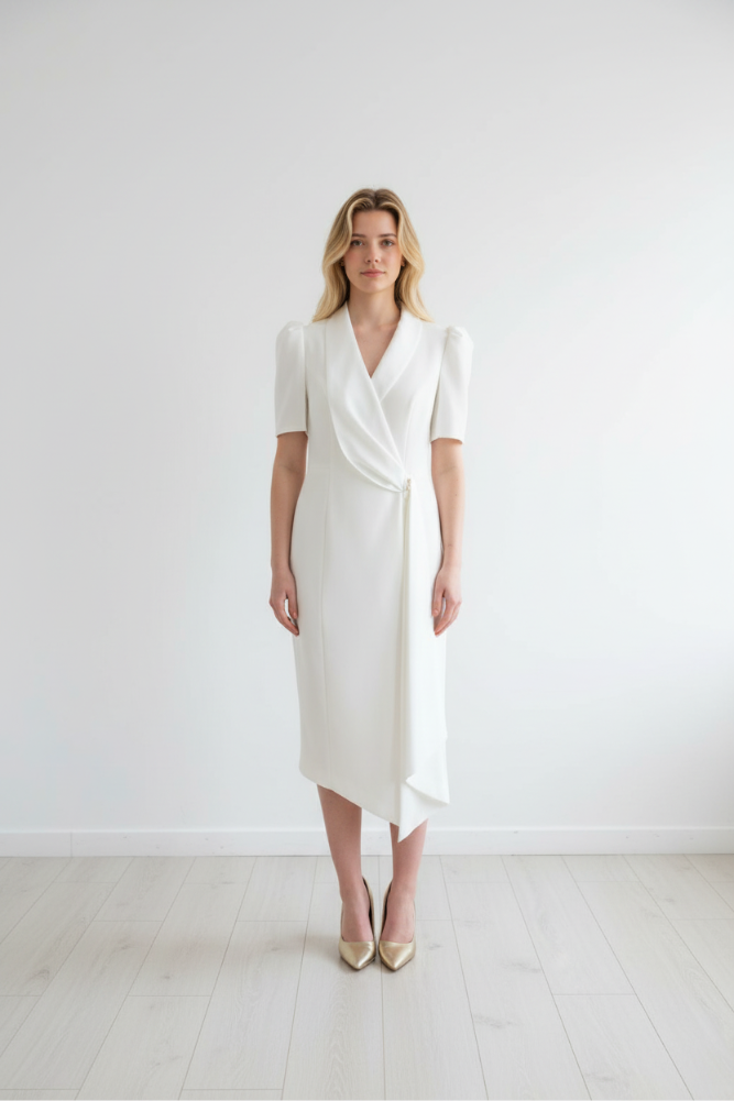 The Idala Dress is a stunning ivory tuxedo pencil dress with a matching satin collar and draping sash. It features and elegant asymmetric hem and unique sleeves.