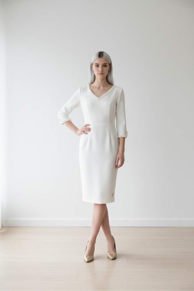 The Irena dress is an elegant, knee-length dress rafted in a refined ivory fabric, featuring a modest, high neckline and three-quarter length sleeves, which provide a classic and sophisticated look. One of the standout details is the embellishment of pearls on the sleeve cuffs, adding a subtle touch of texture.