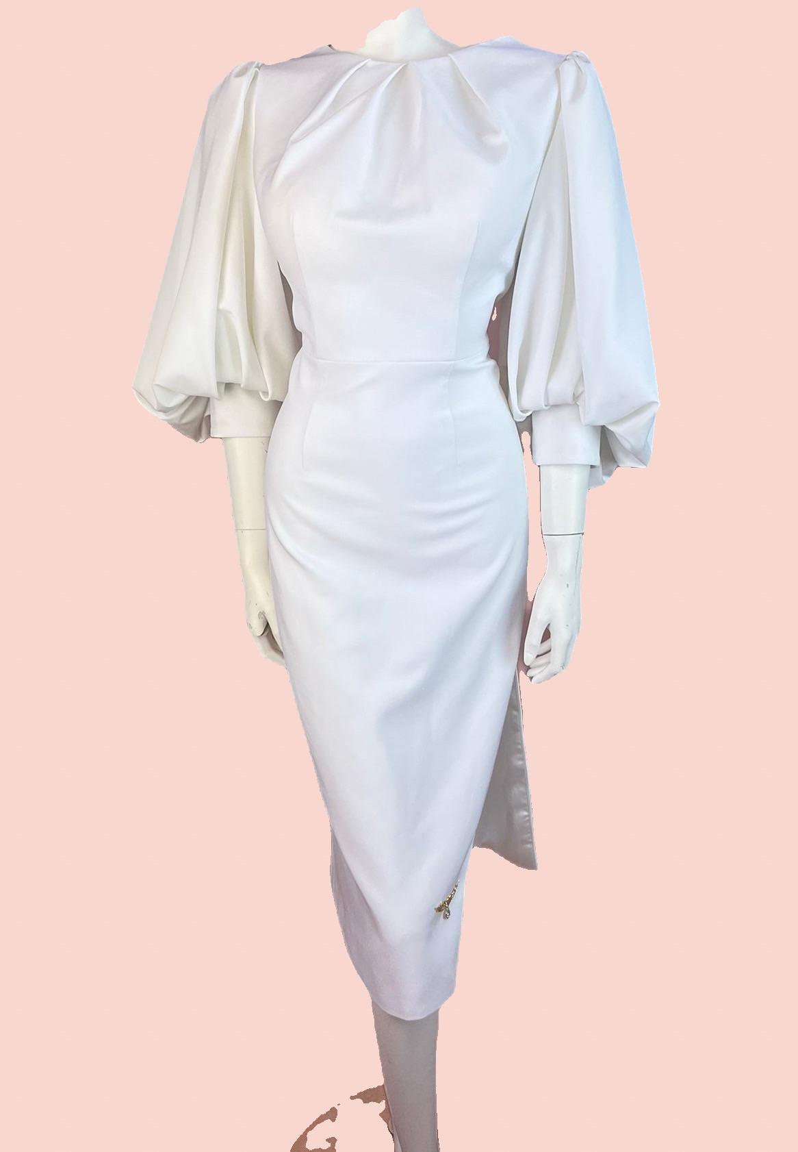 The Jack Dress is an elegant white midi-length dress, with a high neckline and a ruched sleeve detail. One of the standout details is the buttons and the open back on this dress.