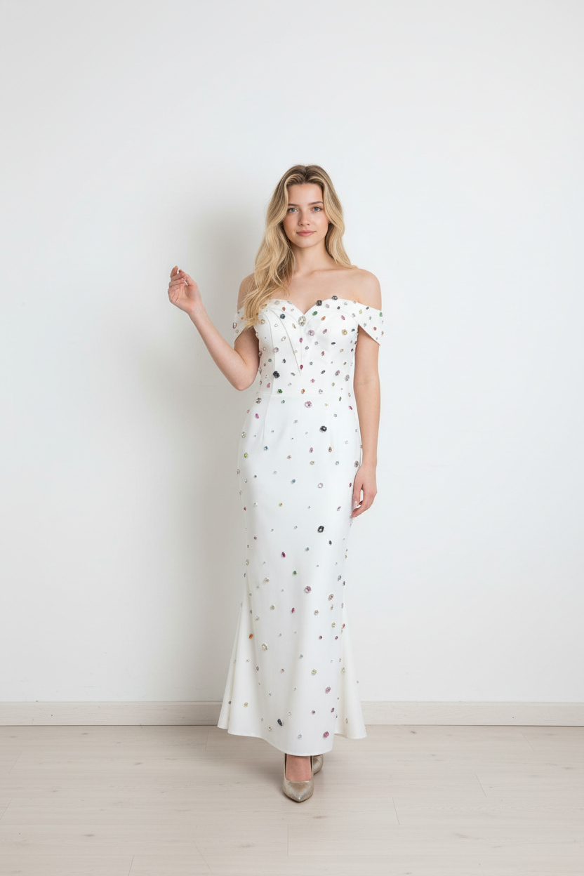 The Jade dress is a beautiful ivory fishtail dress, with a wide V-neck line. There is multi-coloured embellishment scattered all over the dress, adding a