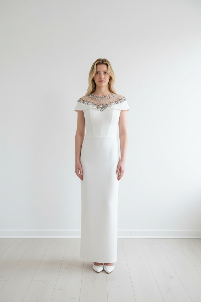 The Jeanna dress is a stunning ivory gown with jewel embellishment on the neckline