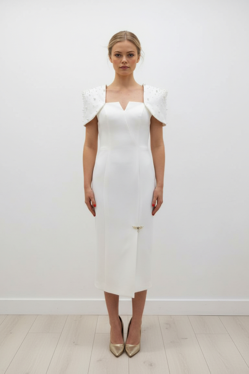 The Jess dress is an elegant pencil dress with a pearl embellished cap sleeve. Coupled with a flattering square neckline and a stunning fabric, you are sure to impress in this design.