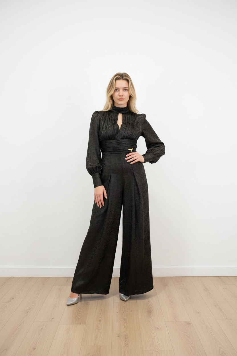 The Kabe jumpsuit is a full-length jumpsuit crafted in a refined gold fabric, featuring a modest, high neckline and full-length sleeves, which provide a classic and sophisticated look. One of the standout details is the open back of the jumpsuit, adding a subtle touch of elegance.