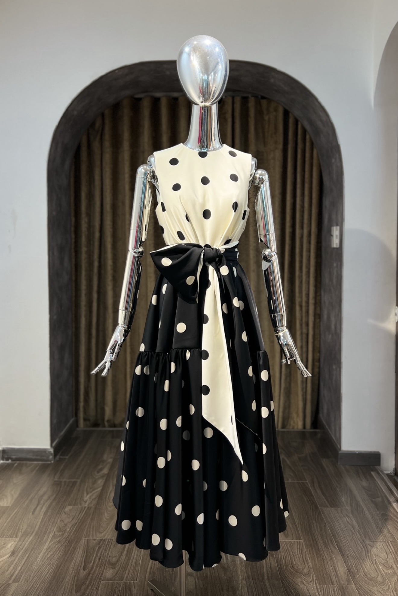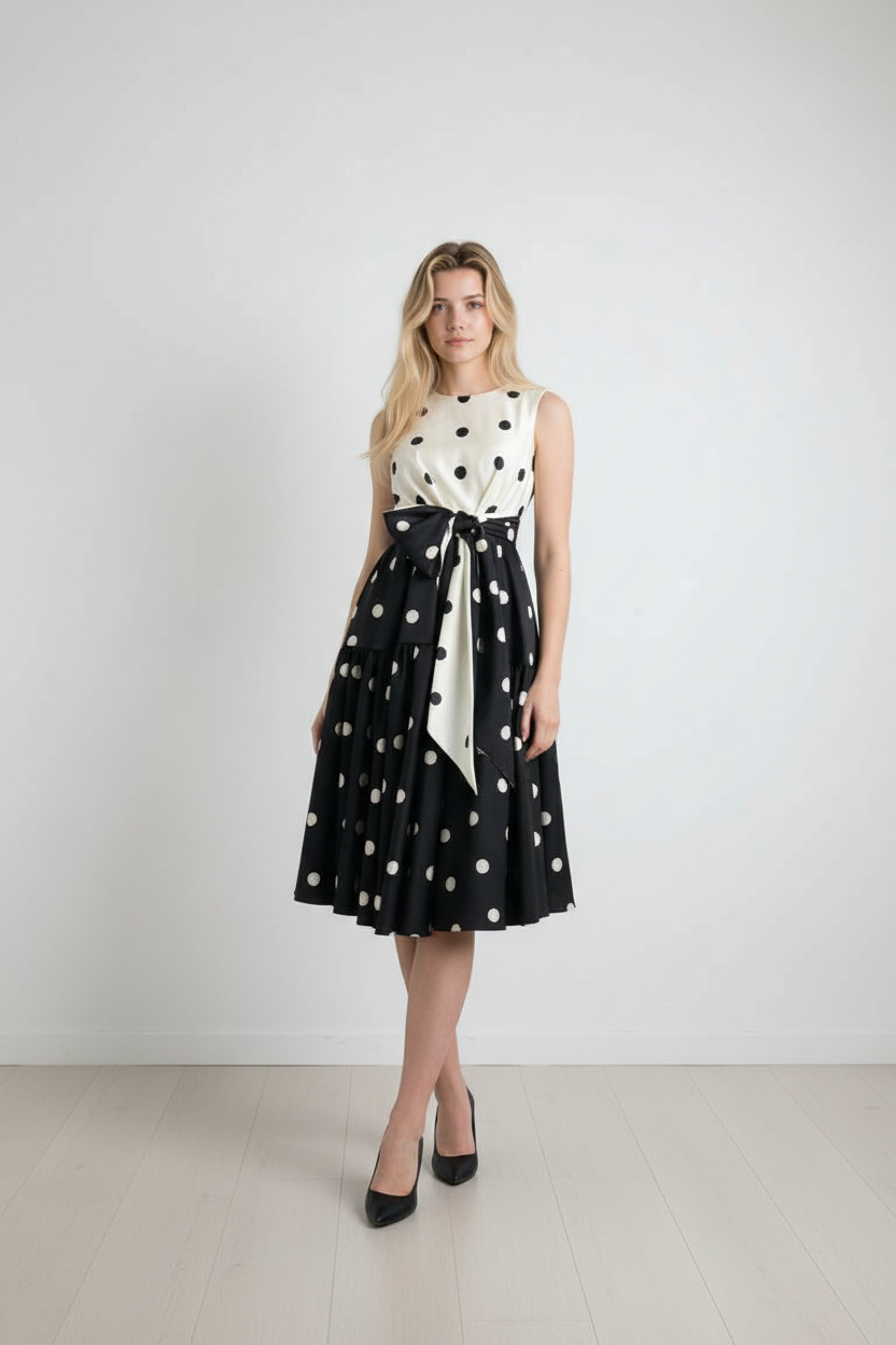 The Kabi Dress features an elegant, midi-length skirt. One of the standout details of this dress is the polka-dot design of the fabric, adding a subtle touch of texture.