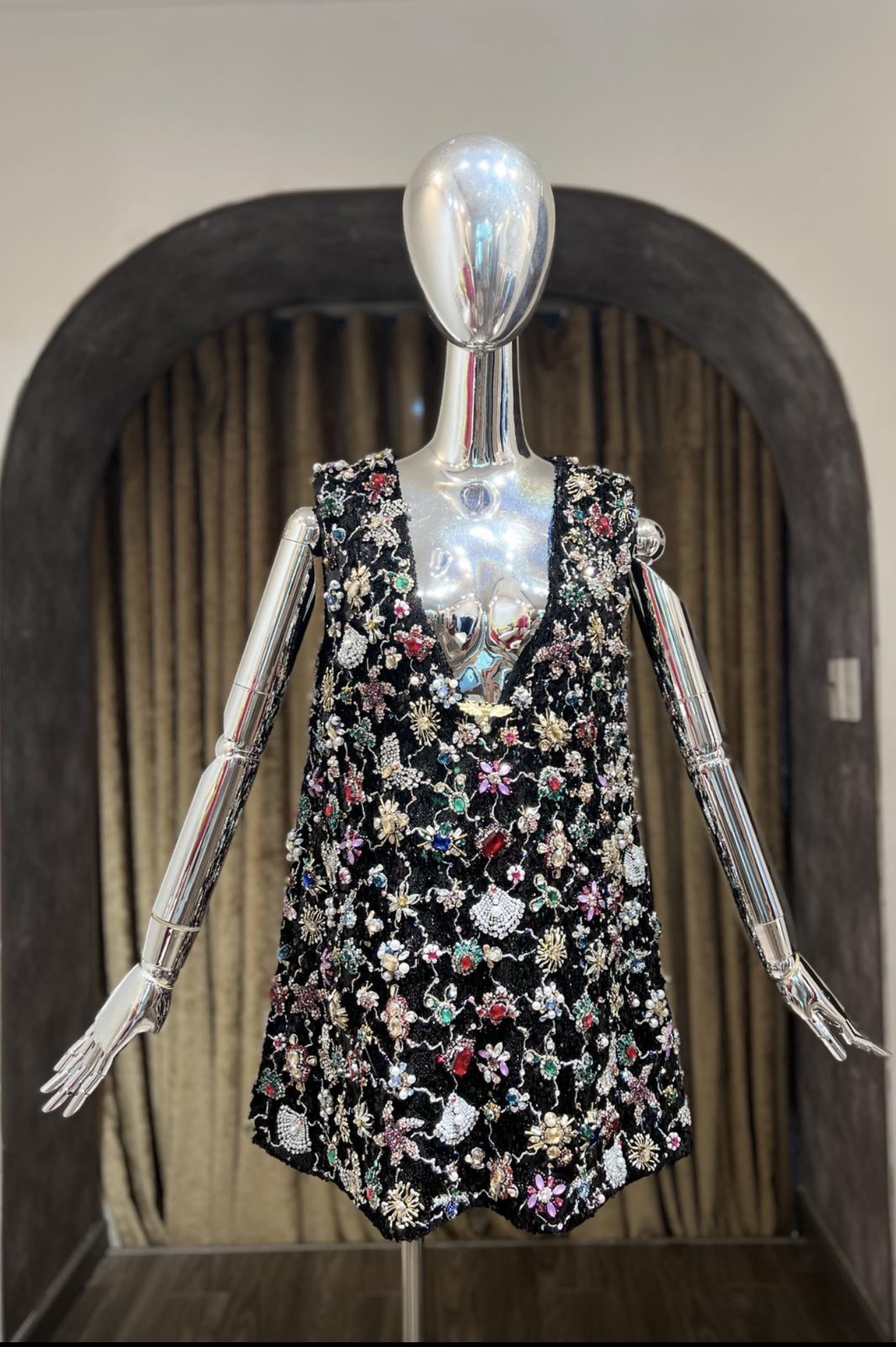 The Kac dress is an elegant, mini-length dress crafted in a refined crepe fabric. The dress features a deep V neckline and heavy embellishment throughout, which provide a classic and sophisticated look.
