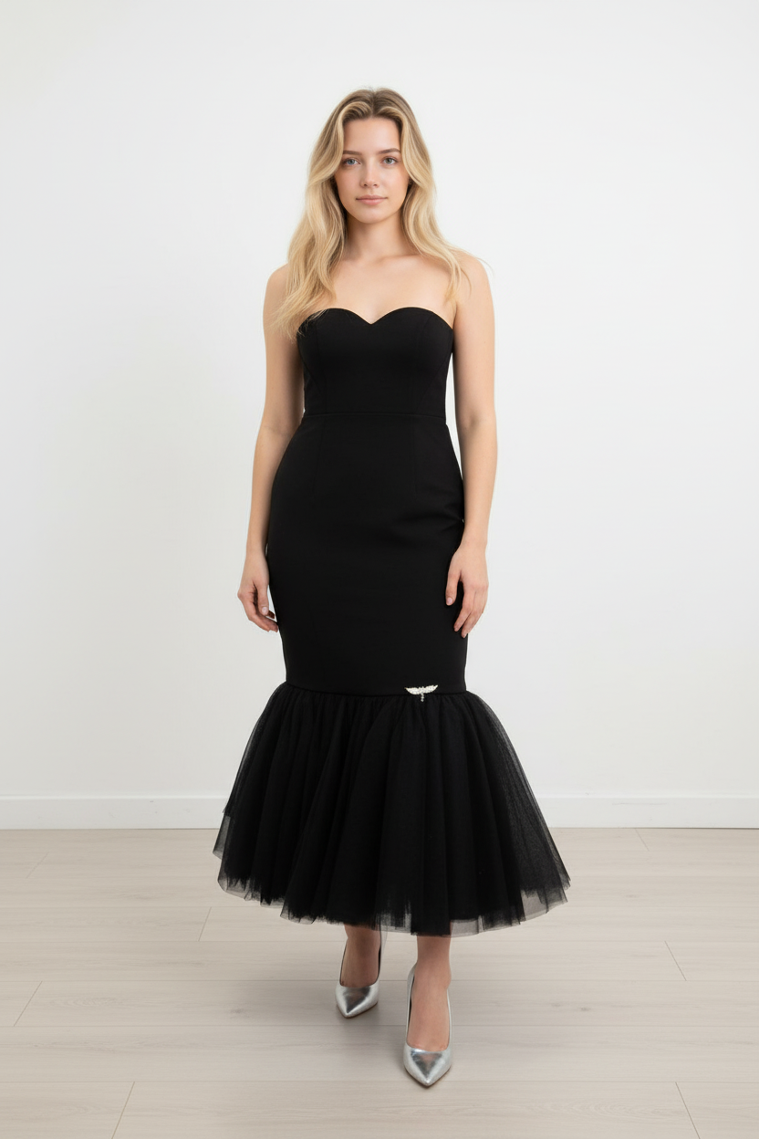 The Kash dress is an elegant, full-length dress crafted in a refined black fabric, featuring a sweetheart neckline which provides a classic and sophisticated look. One of the standout details is the tulle fishtail, adding a subtle touch of texture.