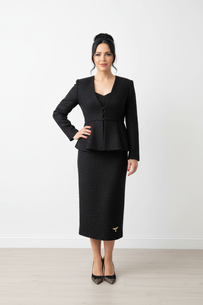 The Kia Suit is an elegant, midi-length skirt crafted in a refined tweed fabric, featuring a top with a V neckline and full length sleeves, which provide a classic and sophisticated look. One of the standout details is the tweed fabric, adding a subtle touch of texture.
