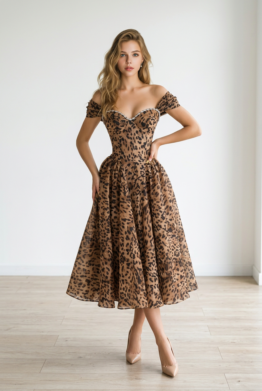 The Lucia Dress features an elegant, midi-length skirt. One of the standout details of this dress is the cheetah design of the fabric, with a chain detail on the neckline, adding a subtle touch of texture.